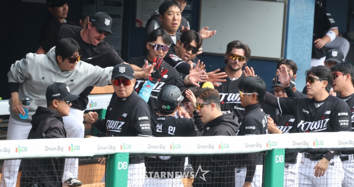 Коллеги приветствуются после того, как Ан Хён Мин, второй басмен на второй базе в начале первого иннинга КТ, забил своевременный дубль Чан Сон У.