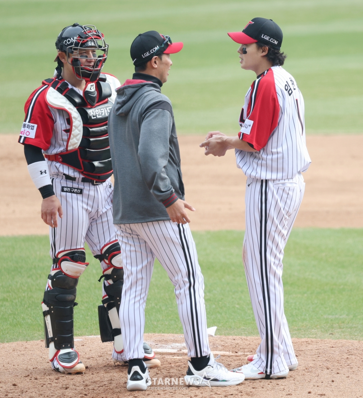 Когда стартер LG Лим Чан Гю показывает трясущийся вид, тренер Ким Кван Сам идет на холм и успокаивает его.