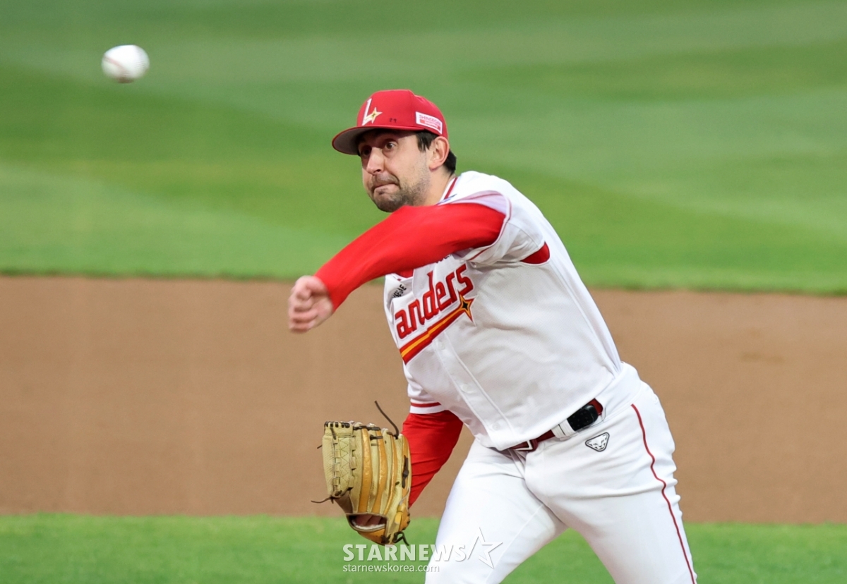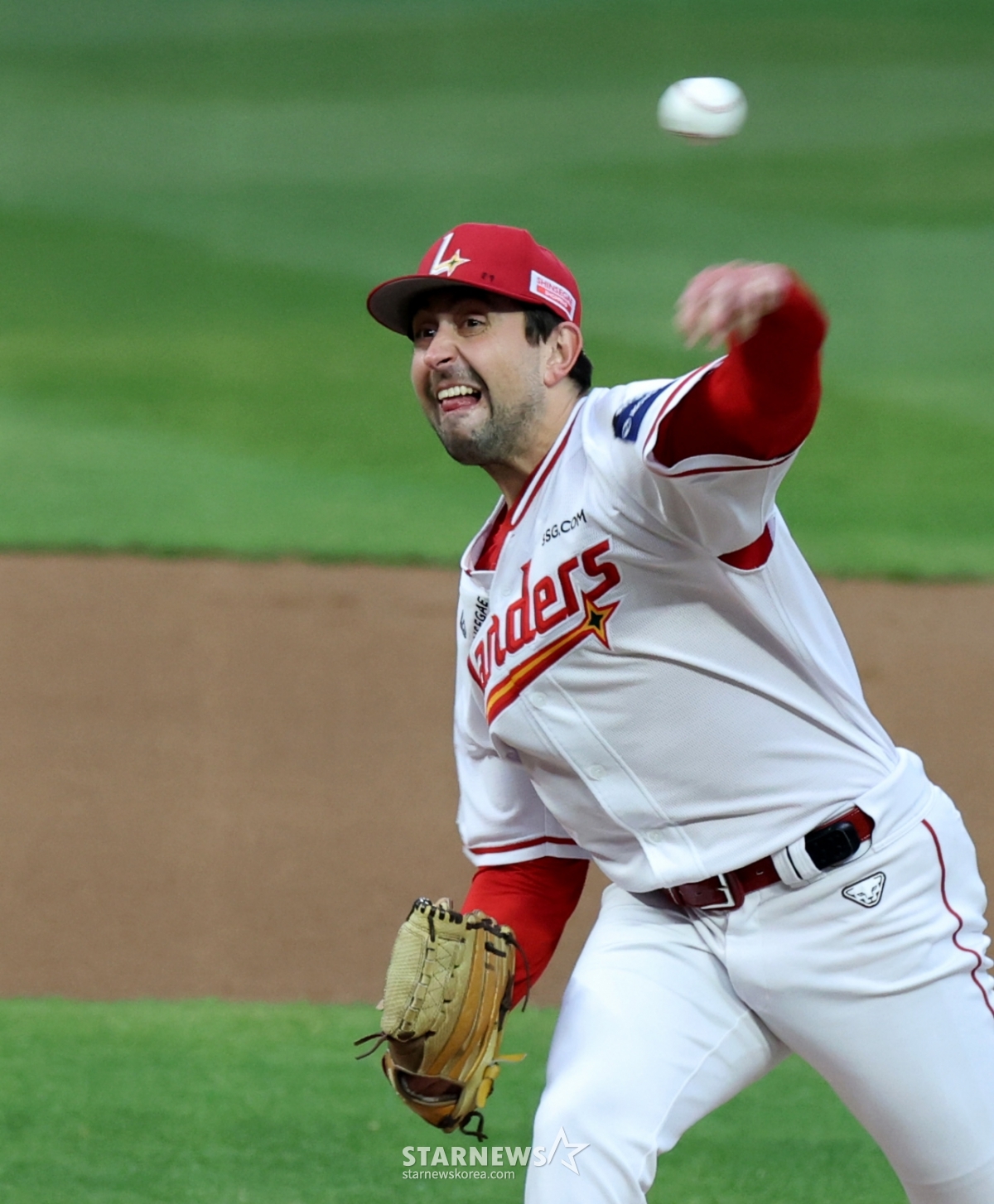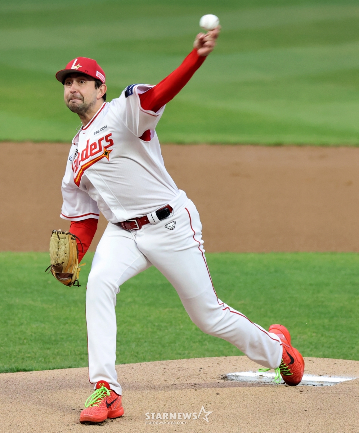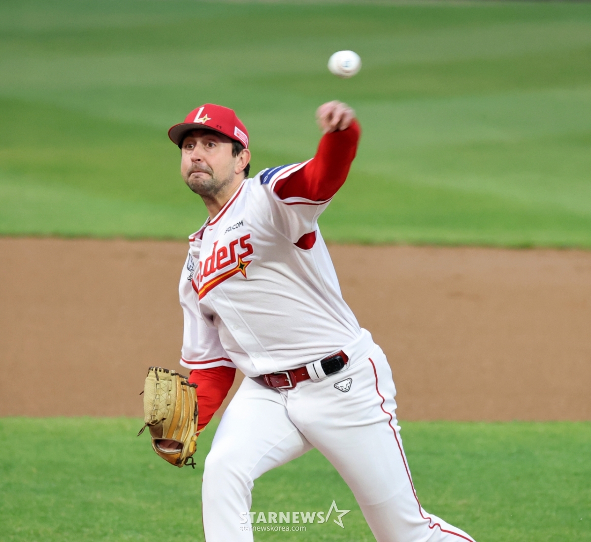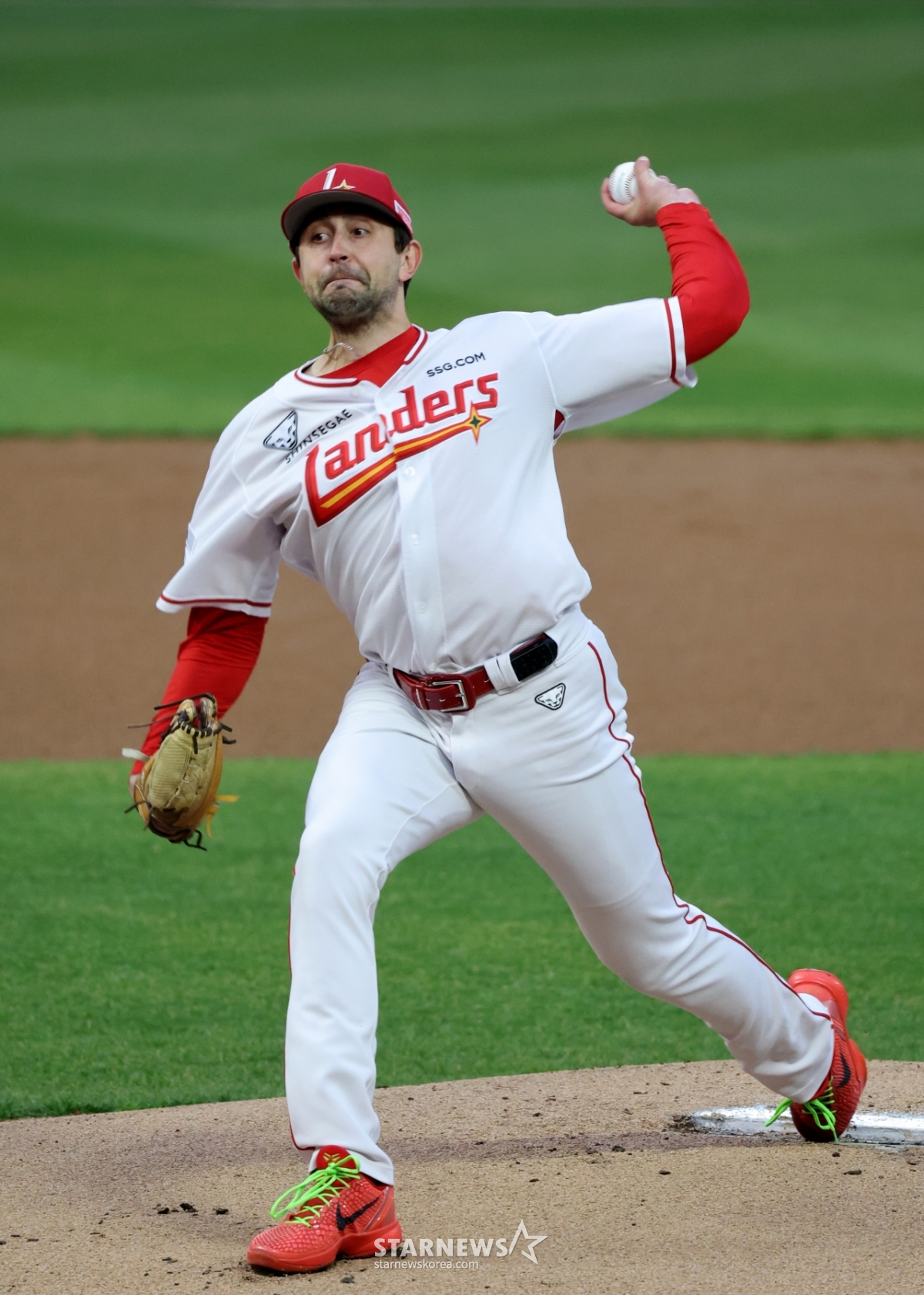 Питчер леворукого питчера SSG Beniziano выступает в качестве стартера на матче между профессиональным бейсболом SSG Landers и Kiwoom Heroes, который состоится на поле SSG Landers в Инчхоне 31-го числа.