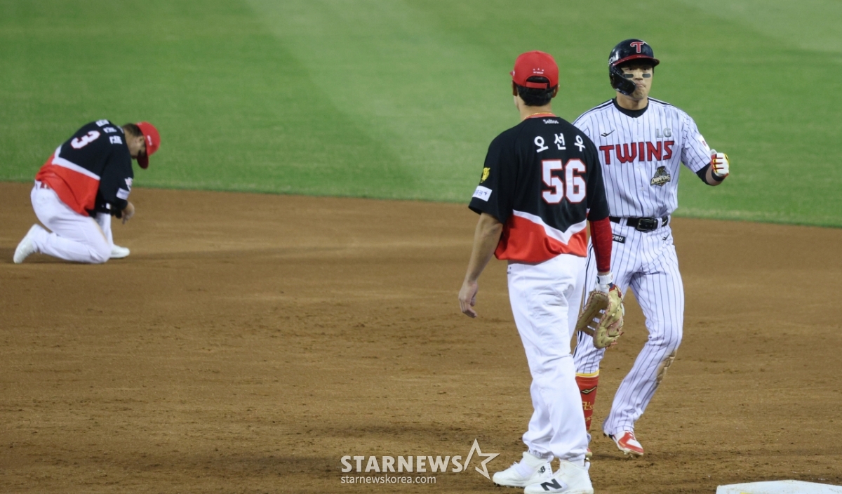 LG Чон Сон Хо проводит церемонию после того, как ударит своевременный удар с одним ударом на первой и третьей базе в конце второго иннинга.