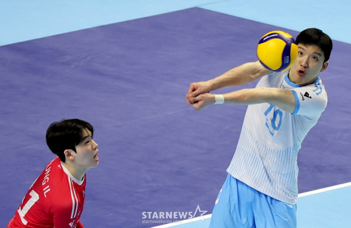 Чон Джи Сок из Korean Air выполняет ревизию в матче против Korean Air и Hyundai Capital в матче за чемпионство Jin Air 2025-2026 V-League, который состоялся в гимназии Гьейян 3-го числа. 2026.04.03.