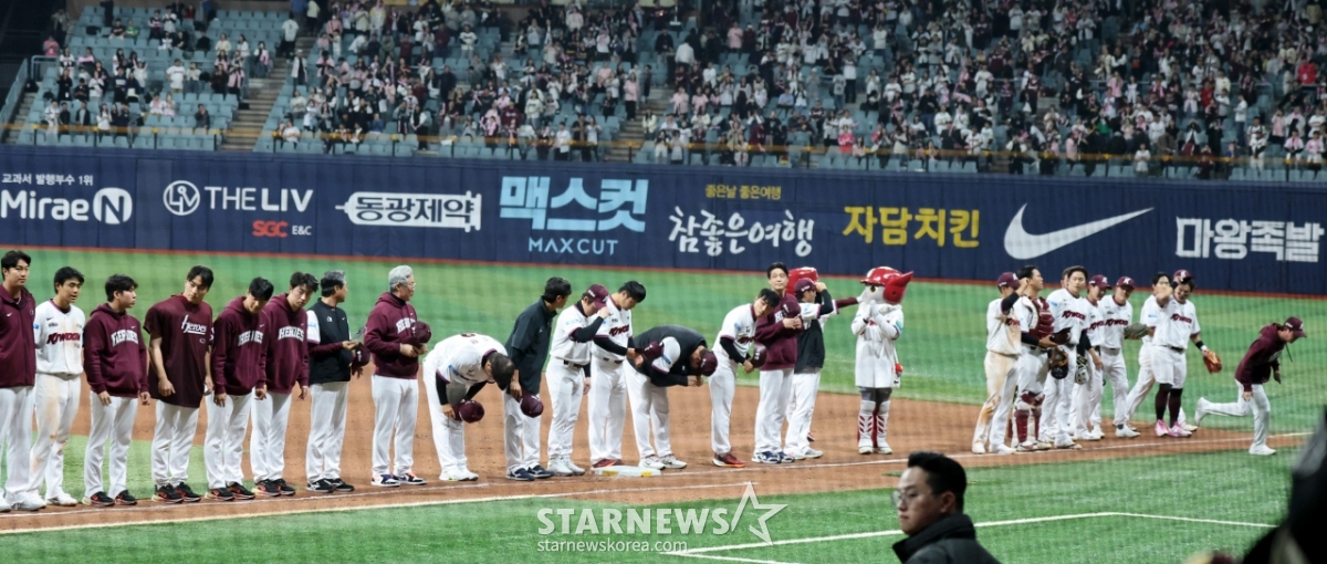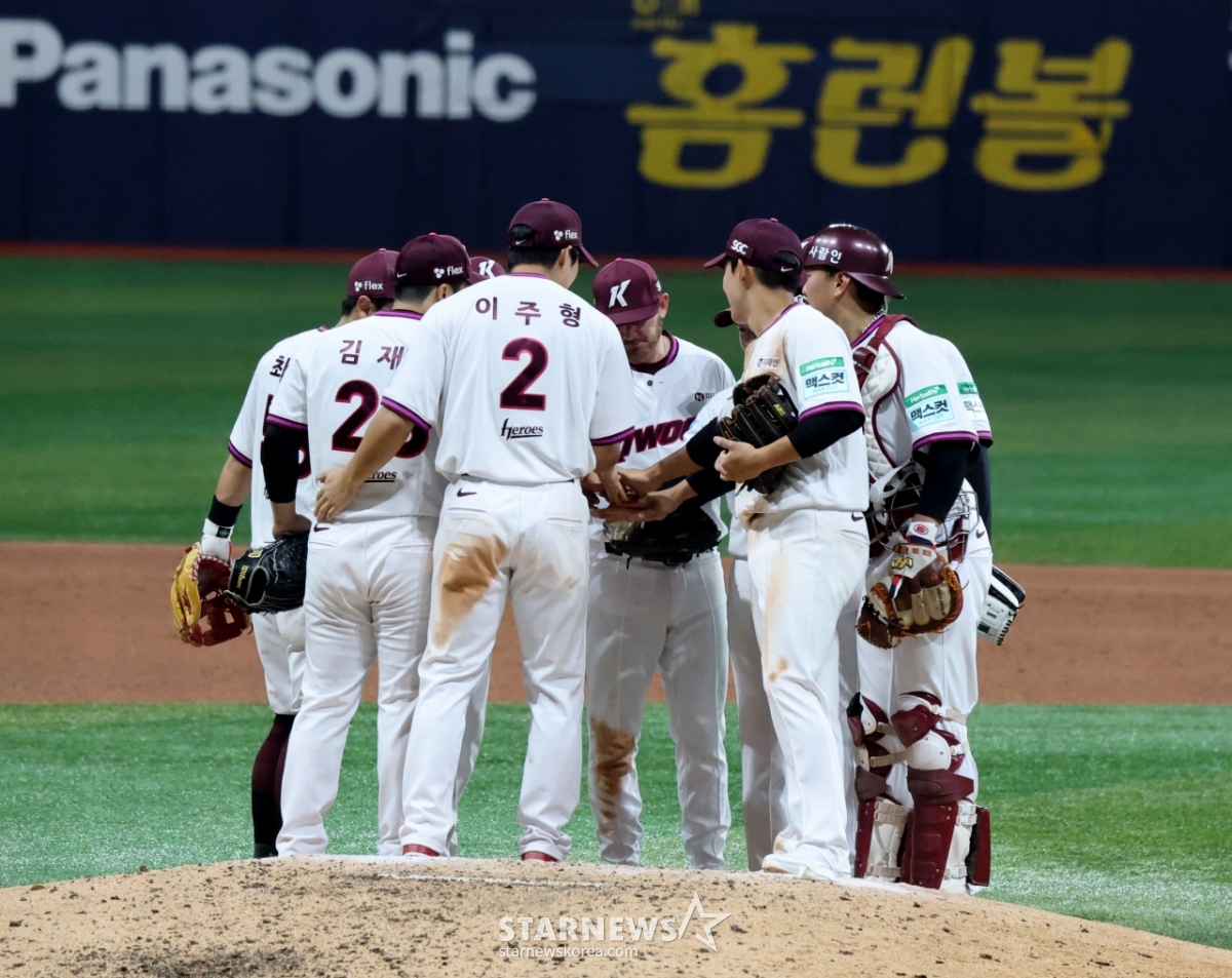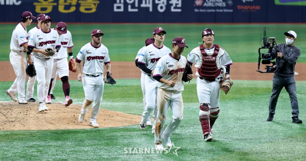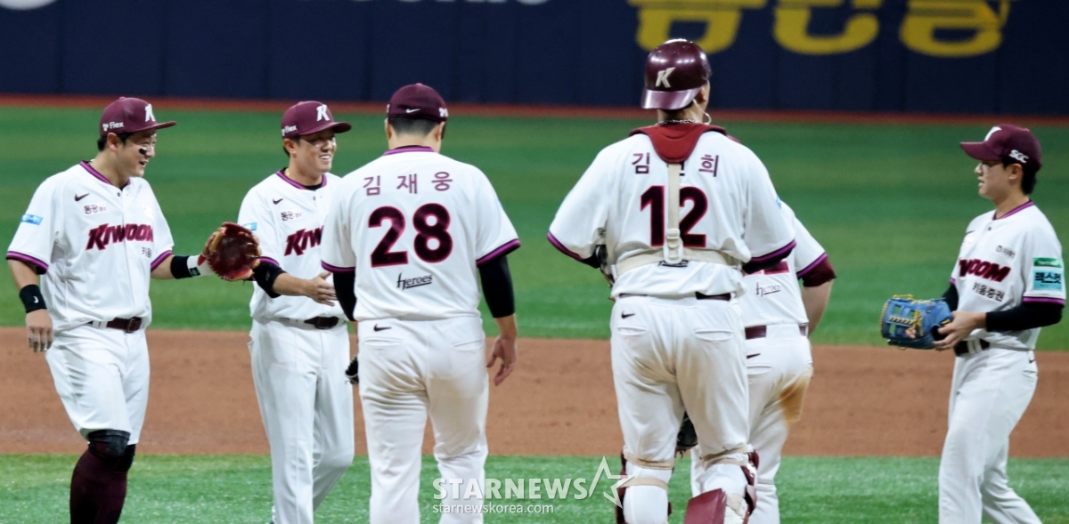 Кивумские игроки празднуют победу с тех пор, как они завершили защиту в начале девятого иннинга Лиги 2026 KBO Кивум Героев и LG Twins, который состоялся в Gocheok Sky Dome 4-го числа. 202604.03.