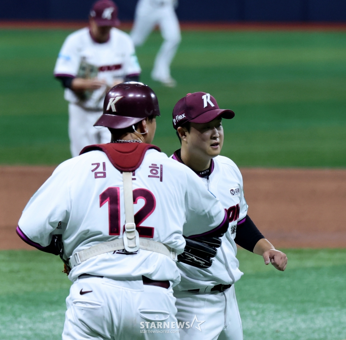 Ким Джэ Ун, завершивший свой девятый иннинг с трехразовым ударом, празднует свой день с захватчиком Ким Гон Хи.