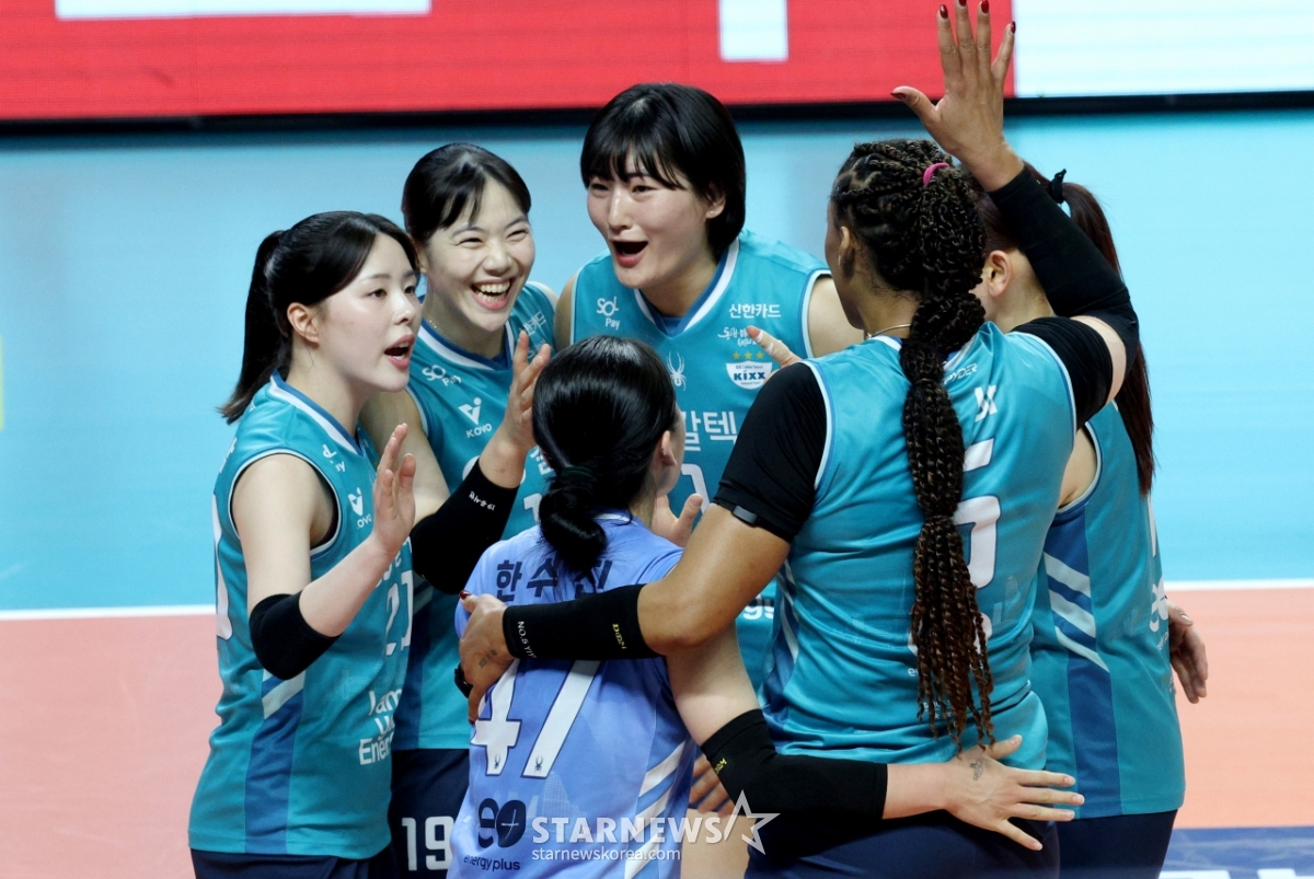 Сильва GS Caltex делится радостью с коллегами после победы в первом сете.