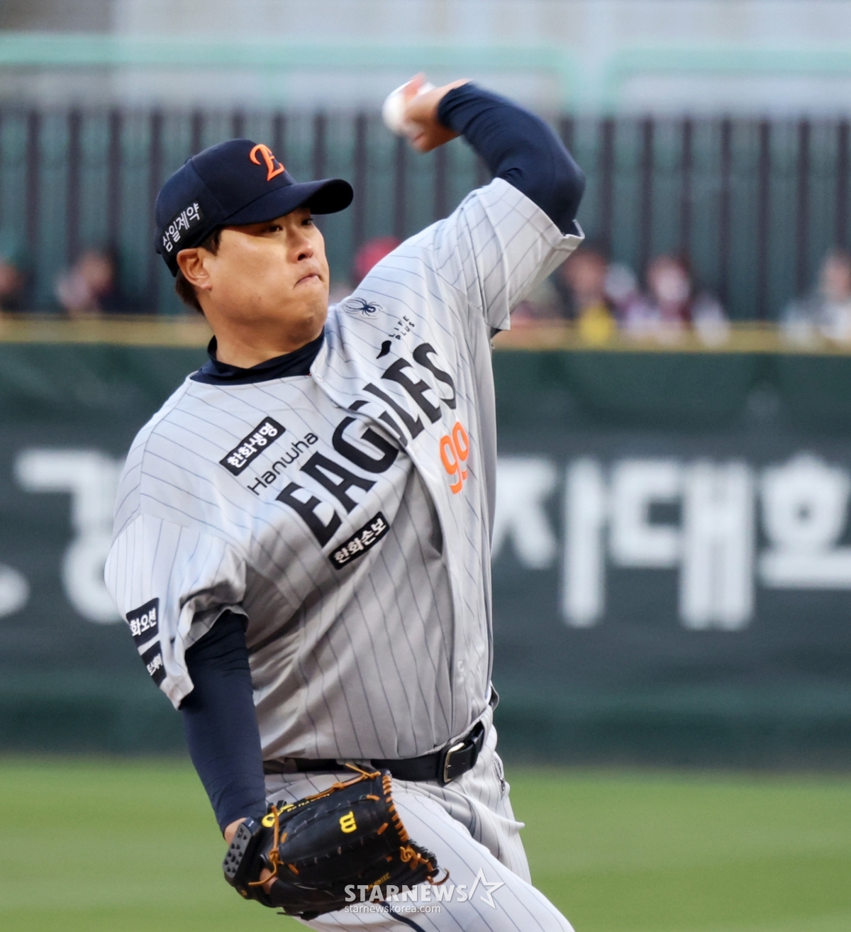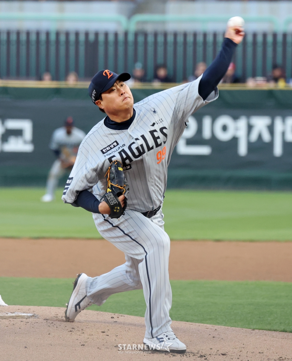 Питчер-левша Ханва Рю Хён Джин начинает стартовую игру в первой игре сезона SSG Landers против Hanwha Eagles в лиге 2026 KBO, которая состоялась на стадионе Ландерсфилд 7-го числа.