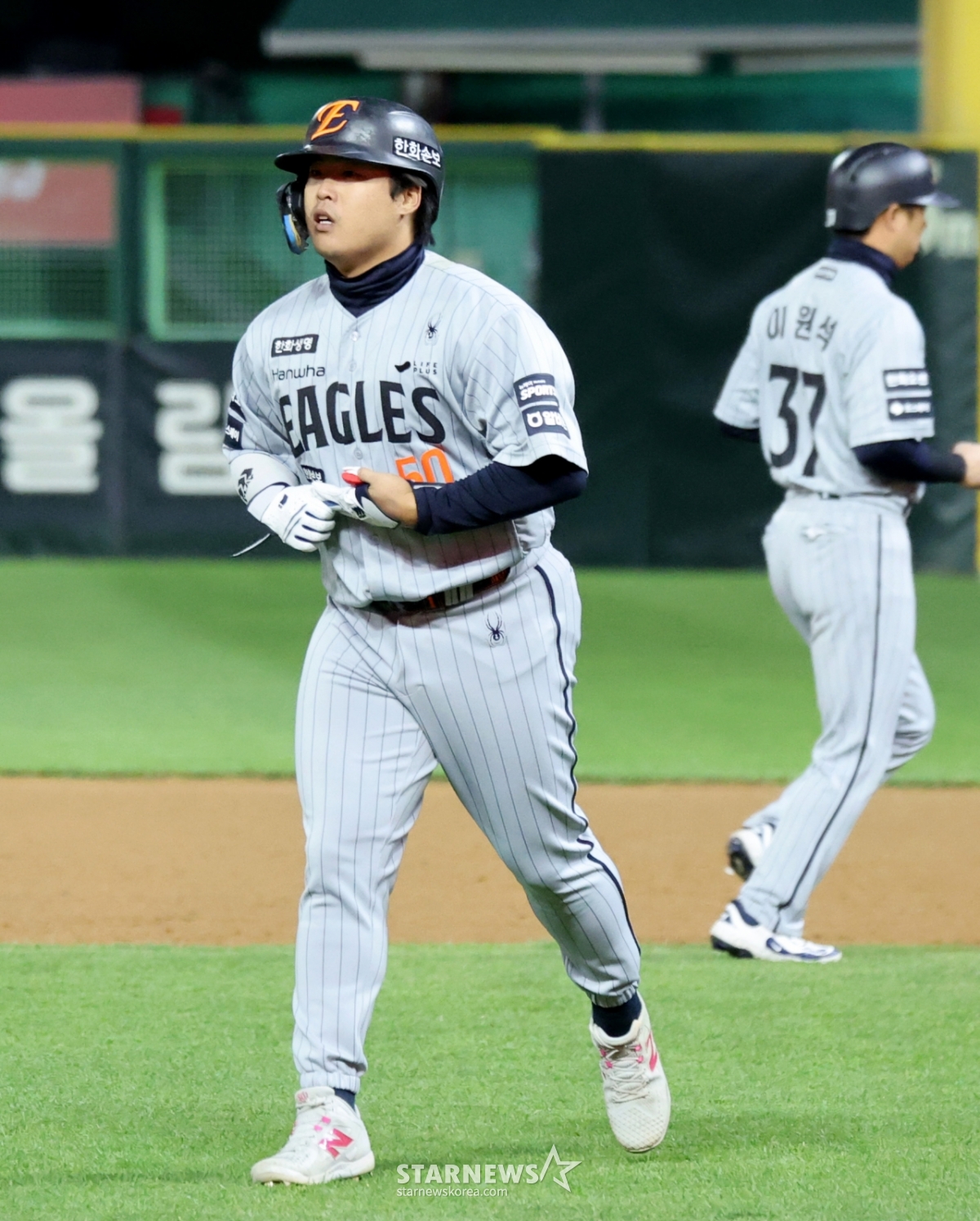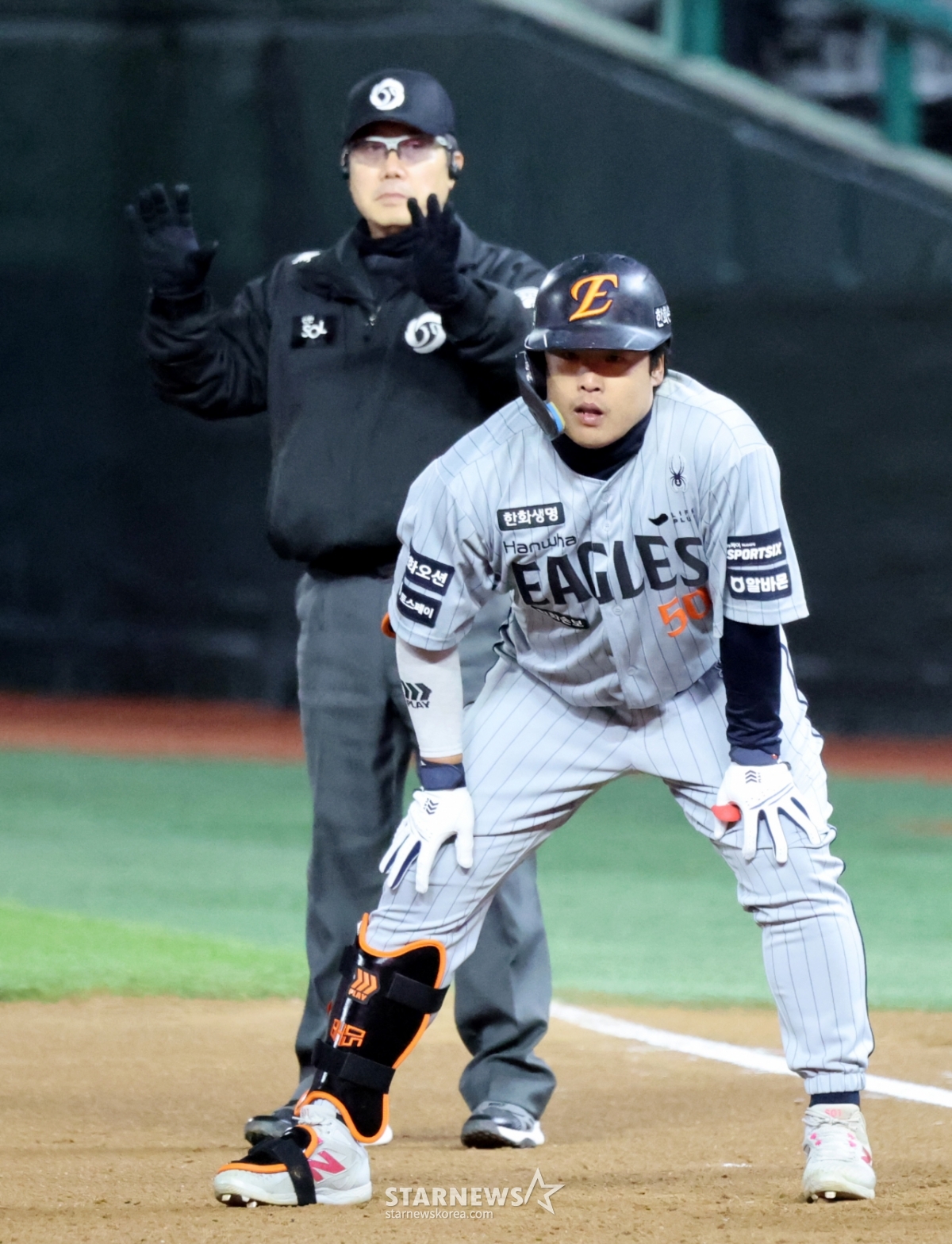 3-й нападающий Ханва Кан Бэк Хо направлен на выбывание после своевременного попадания на базу с одним RBI на первой и второй базе в первом тайме 2026 Лиги KBO «Ханва Иглз» на стадионе «Рандерсфилд» 7-го числа. 2026.04.07.