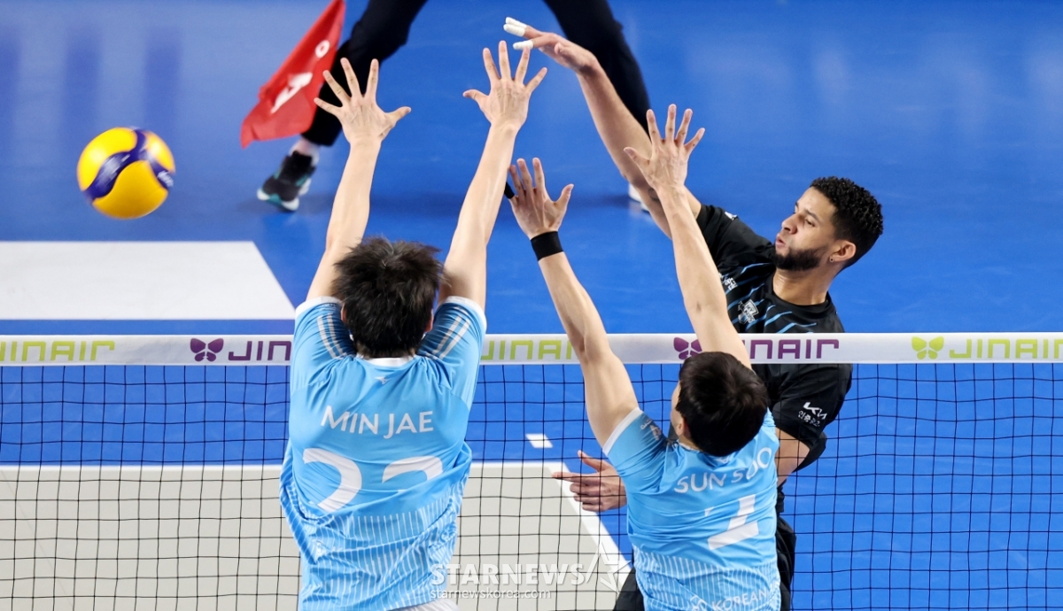 Hyundai Leo пытается ударить по Korean Air и Hyundai Capital в четвертом матче чемпионата лиги Джин Эйр 2025-2026 годов, который состоялся на стадионе Чхонан 8-го числа. 2026.04.08.