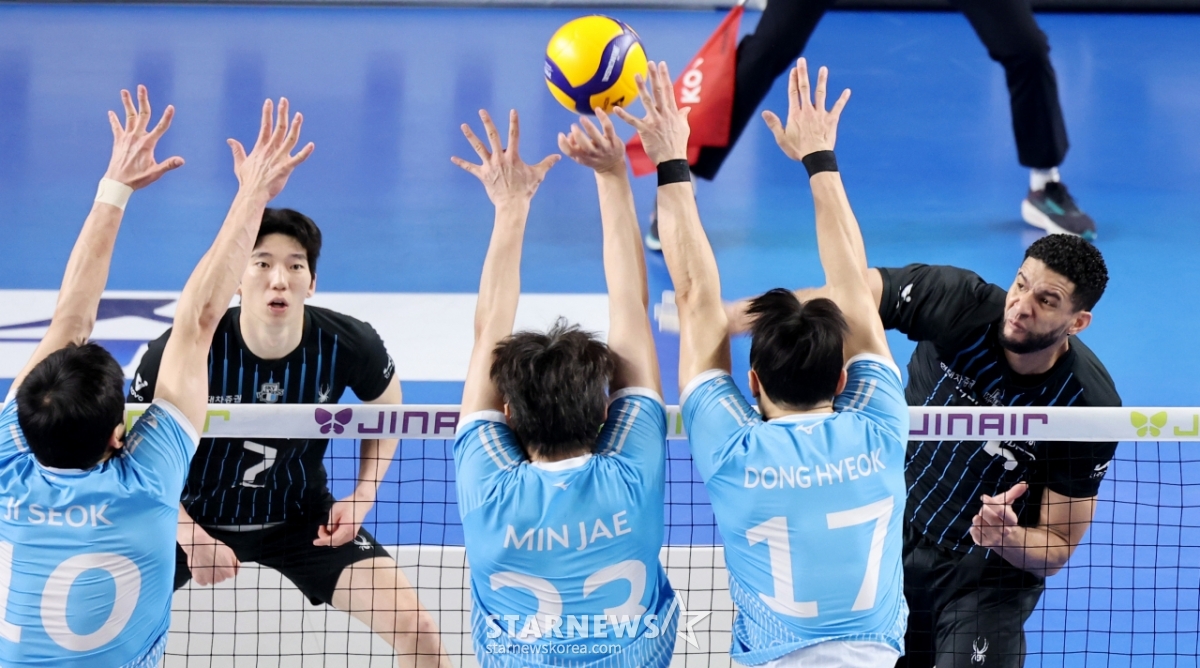 Hyundai Leo наносит удар по тройному блоку Korean Air и Hyundai Capital в четвертом матче чемпионата лиги Джин Эйр 2025-2026 годов, который прошел в гимназии Чхонангапсун 8-го числа. 2026.04.08.