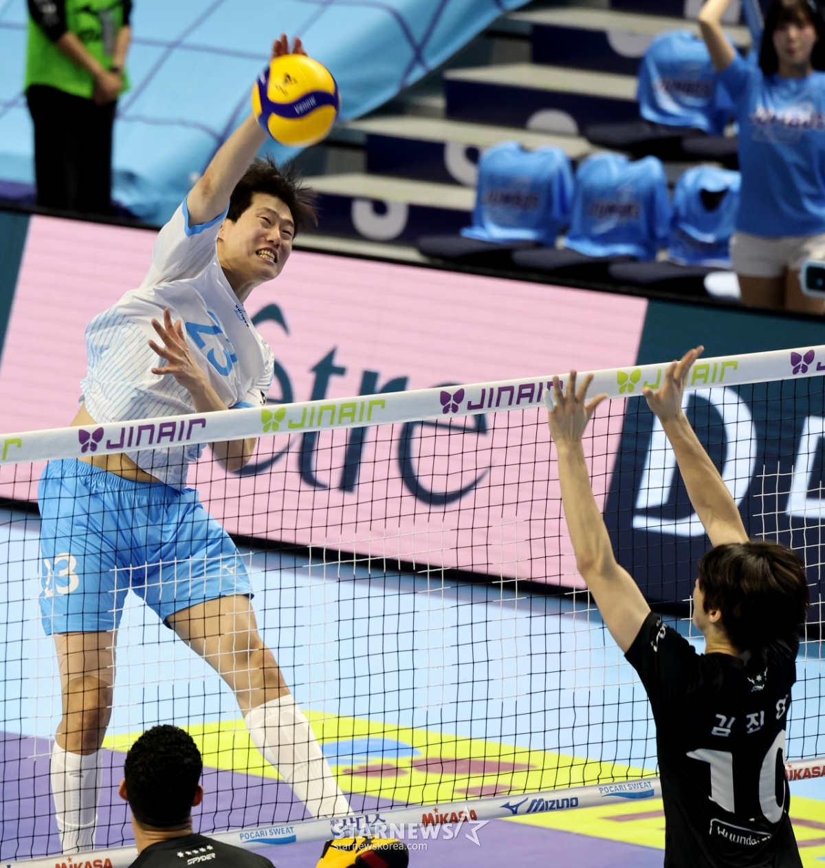 Ким Мин Чжэ из Korean Air преуспевает в пятом матче с Korean Air и Hyundai Capital, который состоялся 10-го числа в Gyeyang Gymnasium в Инчхоне. 2026.04.10.