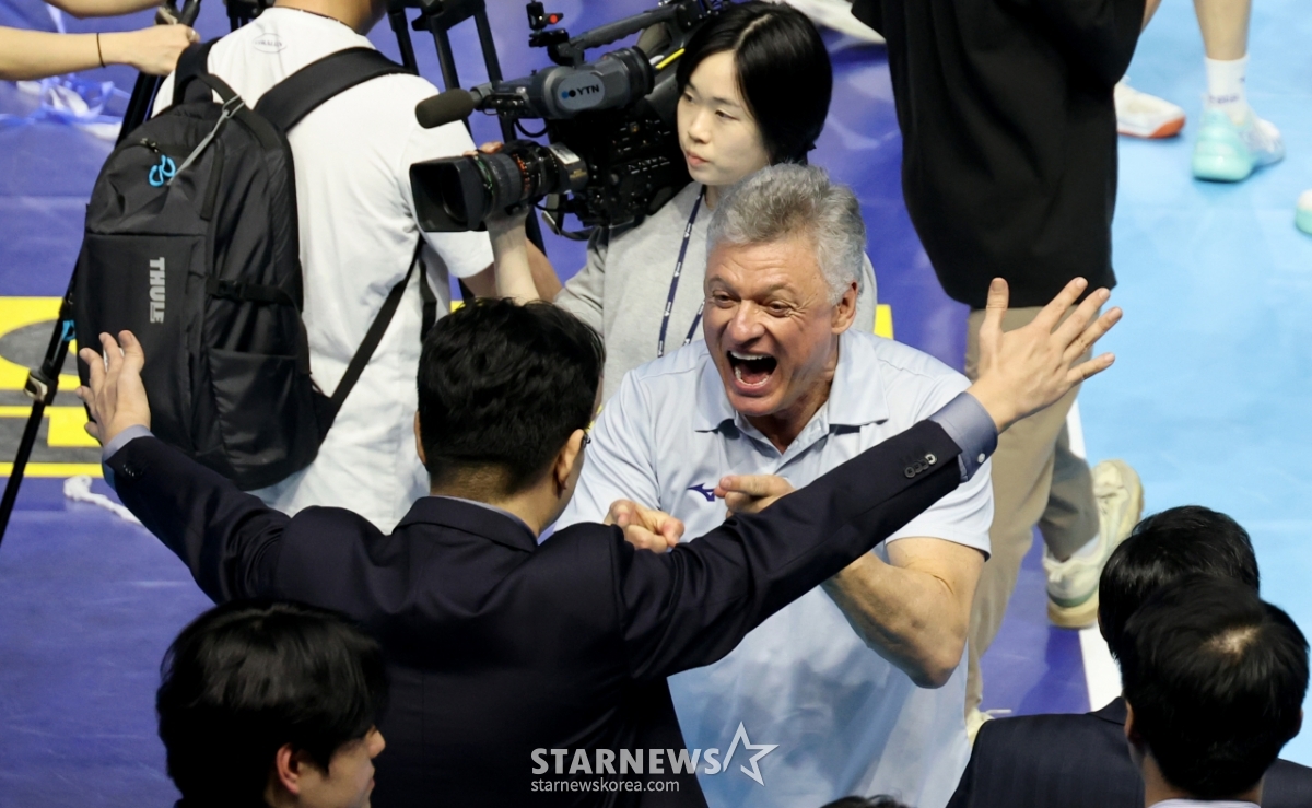Тренер Хеннан обнимает владельца клуба Чо Вон Тэ после победы в 5-й игре Hyundai Capital с Korean Air в чемпионате лиги Джин Эйр 2025-2026 V, которая состоялась 10-го числа на стадионе Гьейян в Инчхоне. 2026.04.10.