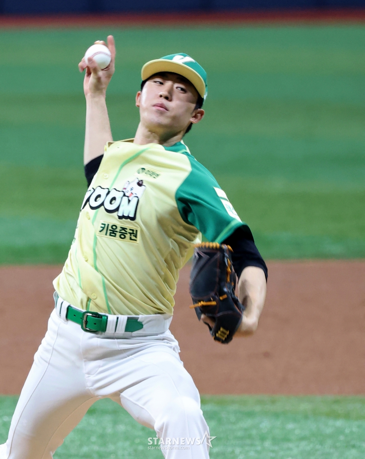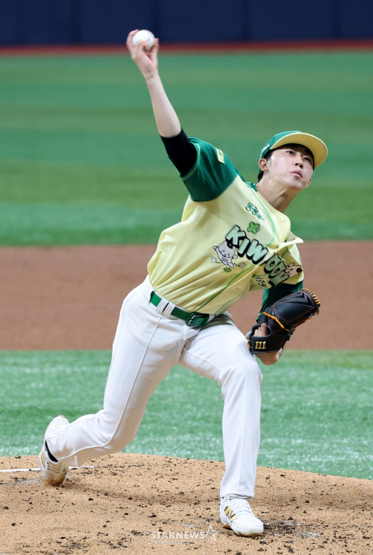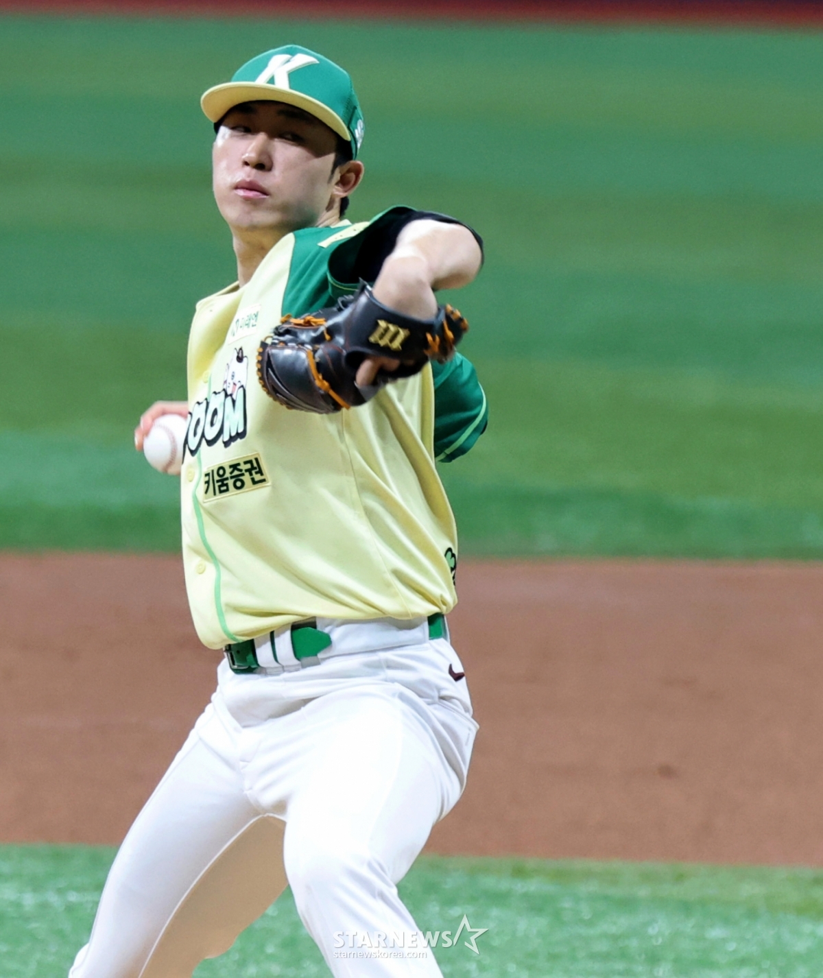 Питчер Кивума Ву Ван Пэ Дон Хён выступает после Ан Ву Чжина в начале второго иннинга между Lotte Giants Лиги KBO 2026 года и Kiwoom Heroes, который состоялся в Gocheok Sky Dome 12-го числа. 2026.04.12.