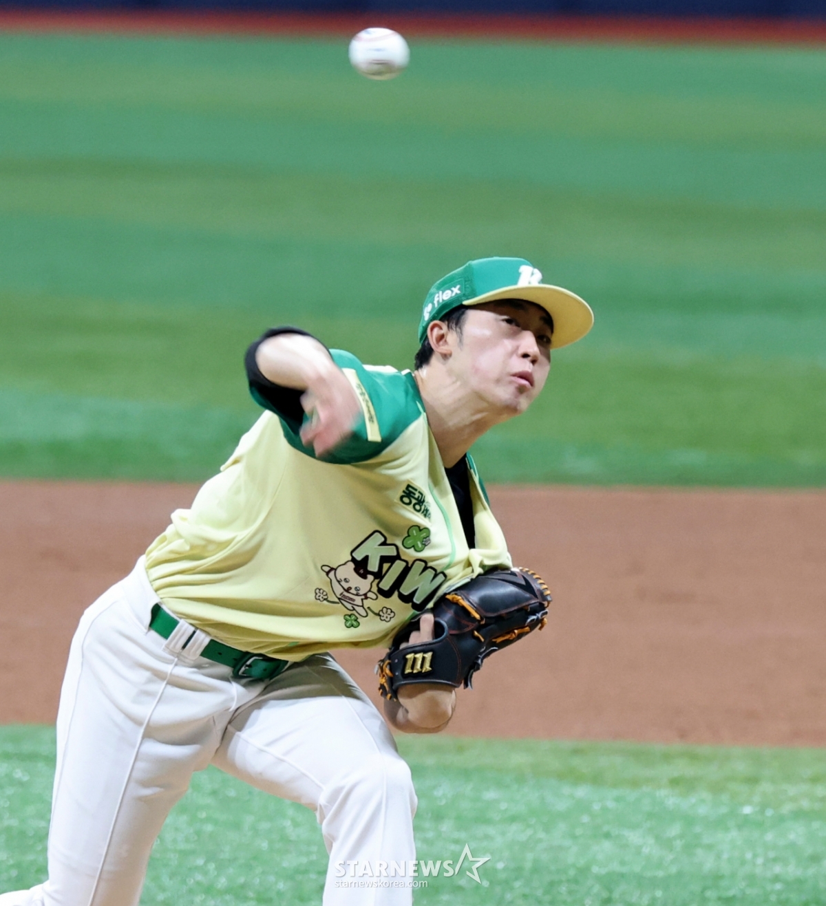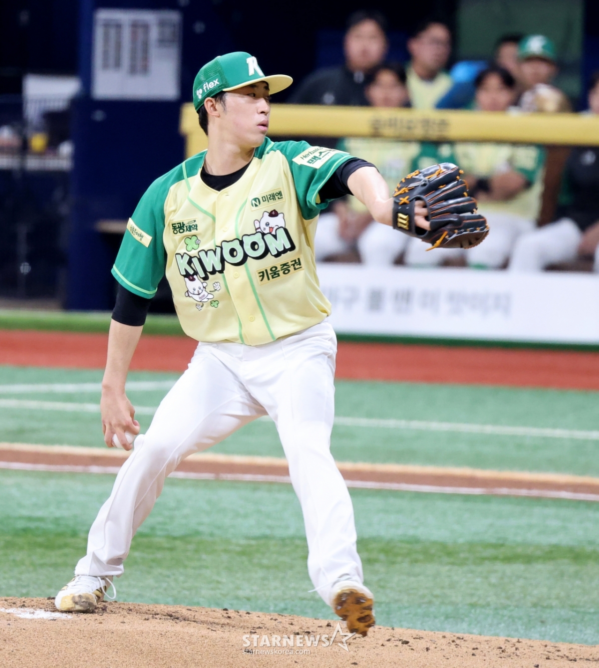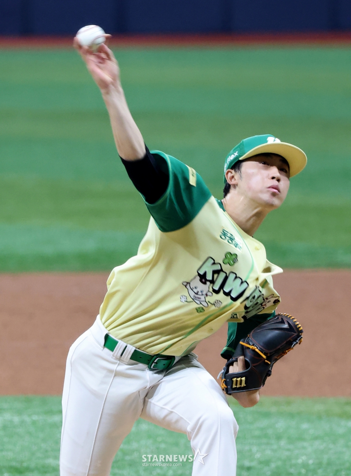 Питчер Кивума Ву Ван Пэ Дон Хён выступает после Ан Ву Чжина в начале второго иннинга между Lotte Giants Лиги KBO 2026 года и Kiwoom Heroes, который состоялся в Gocheok Sky Dome 12-го числа. 2026.04.12.
