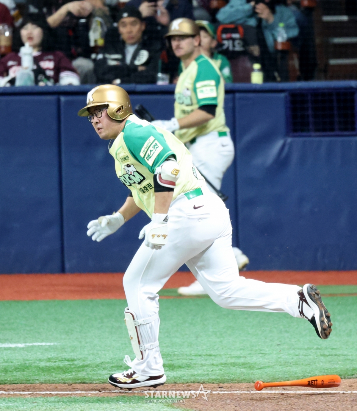 Кивум Ан Чи Хонг наносит удар в матче между Lotte Giants и Kiwoom Heroes в лиге KBO 2026 года, который состоялся в Gocheok Sky Dome 12-го числа. Ан Чи Хонг ударил своевременный удар в конце третьего иннинга. 2026.04.12.