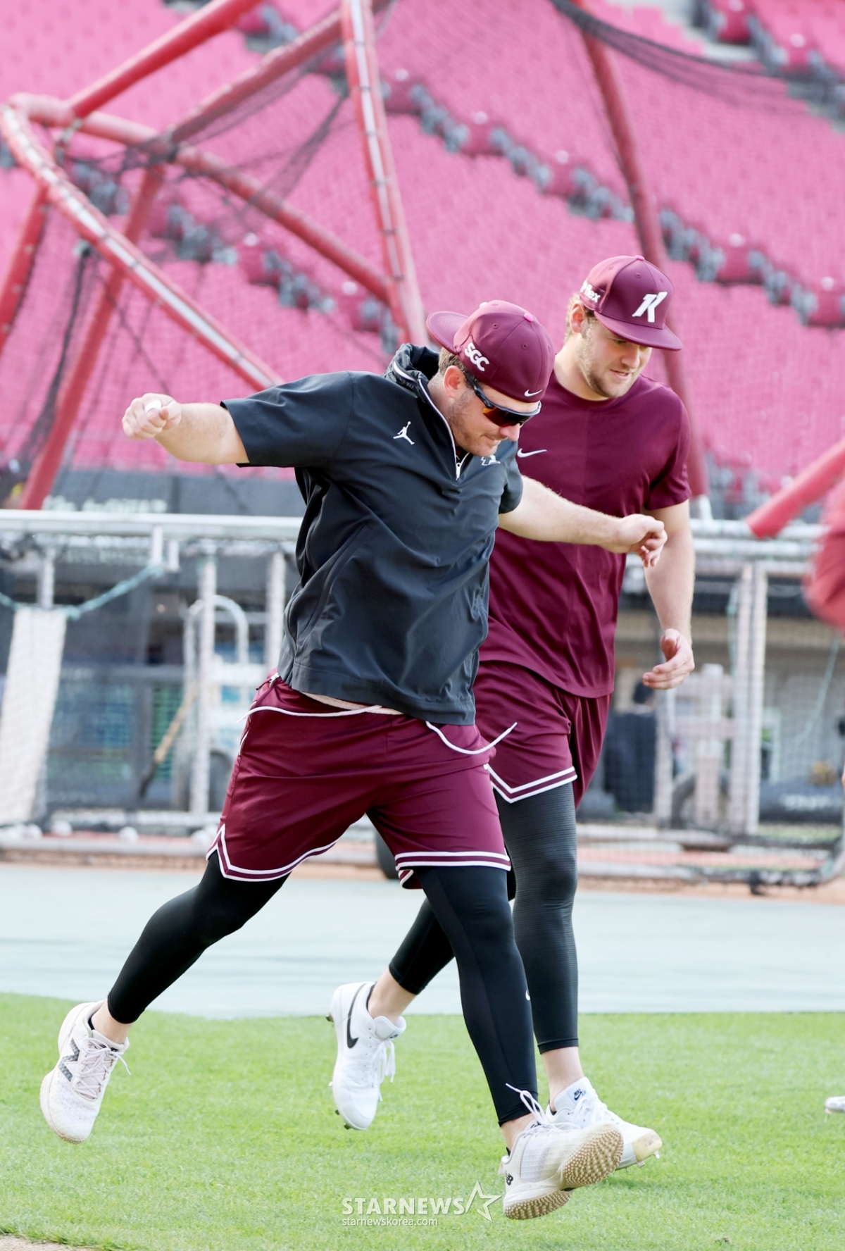 Кивум Брукс и Уайлс расслабляются перед матчем между Киа Тайгерс и Кивумом Героями Лиги 2026 KBO, который состоится на стадионе чемпионов KIA в Кванджу 16-го числа.2026.04.16.