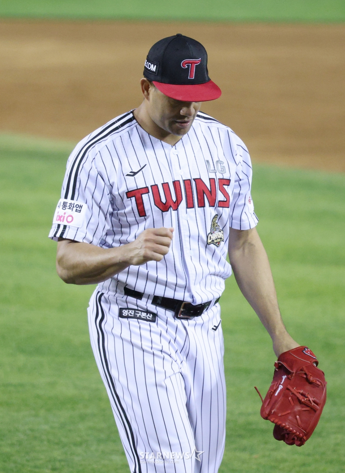 Стартер LG Chirinos после пяти ударов направляется к выходу.