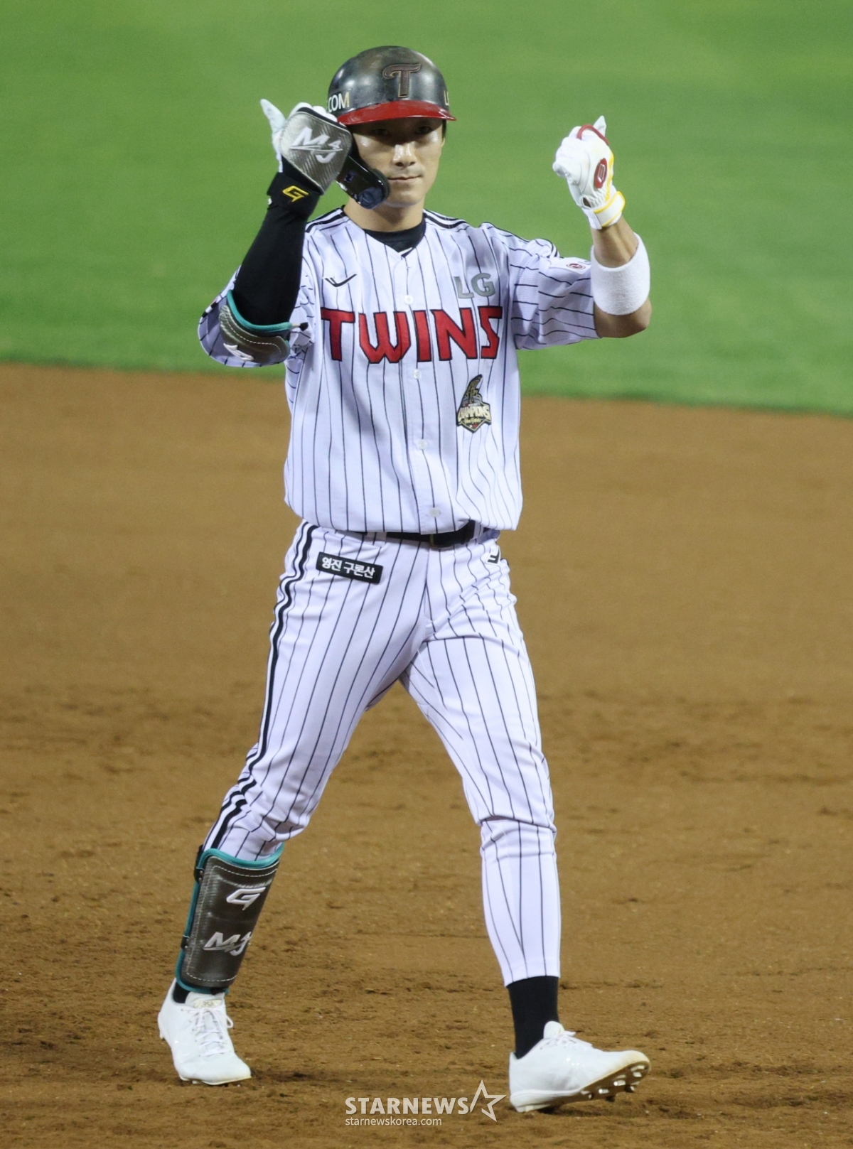 Шин Мин Чжэ из LG проводит церемонию после того, как ударит своевременный удар с одним ИКР на 2-й и 2-й базах в конце 7-го иннинга.