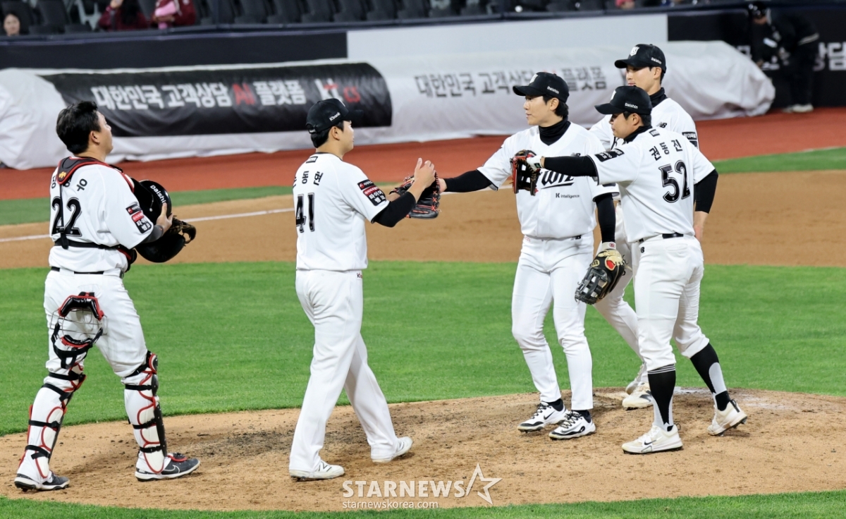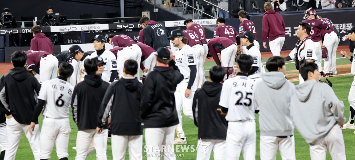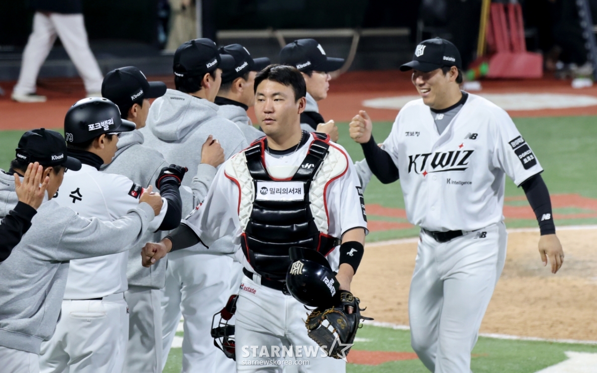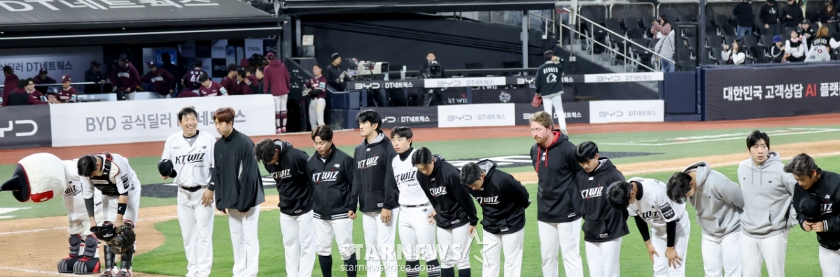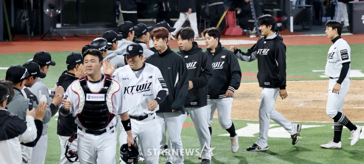 Игроки, такие как КТ-погрузчик Чан Сон Ву, поздравляют тренера Ли Кан Чхоля после победы со счетом 5-0 между лигой КТ-Виз 2026 в парке КТ-Виз в Сувоне 17-го числа. Кивум проиграл четыре игры подряд.