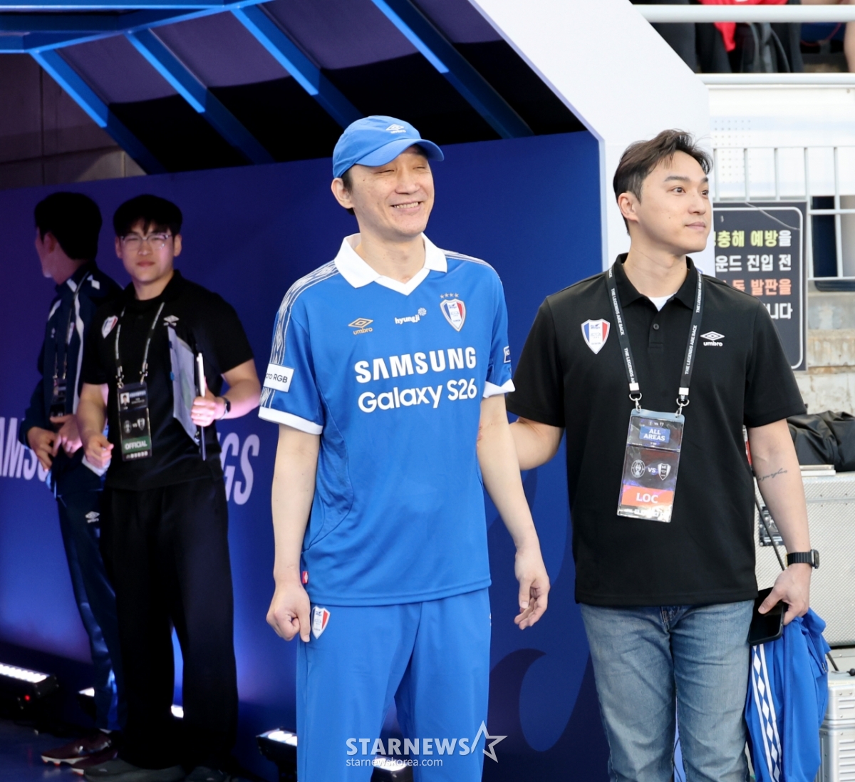 Шин Ён Рок, тренер легенд Сувона Самсунга, сопровождает Вандесар и тренера Со Уон-вона в матче легенд между OGFC и Suwon Samsung, который состоится на стадионе Кубка мира Сувона 19-го числа. 2026.04.19.