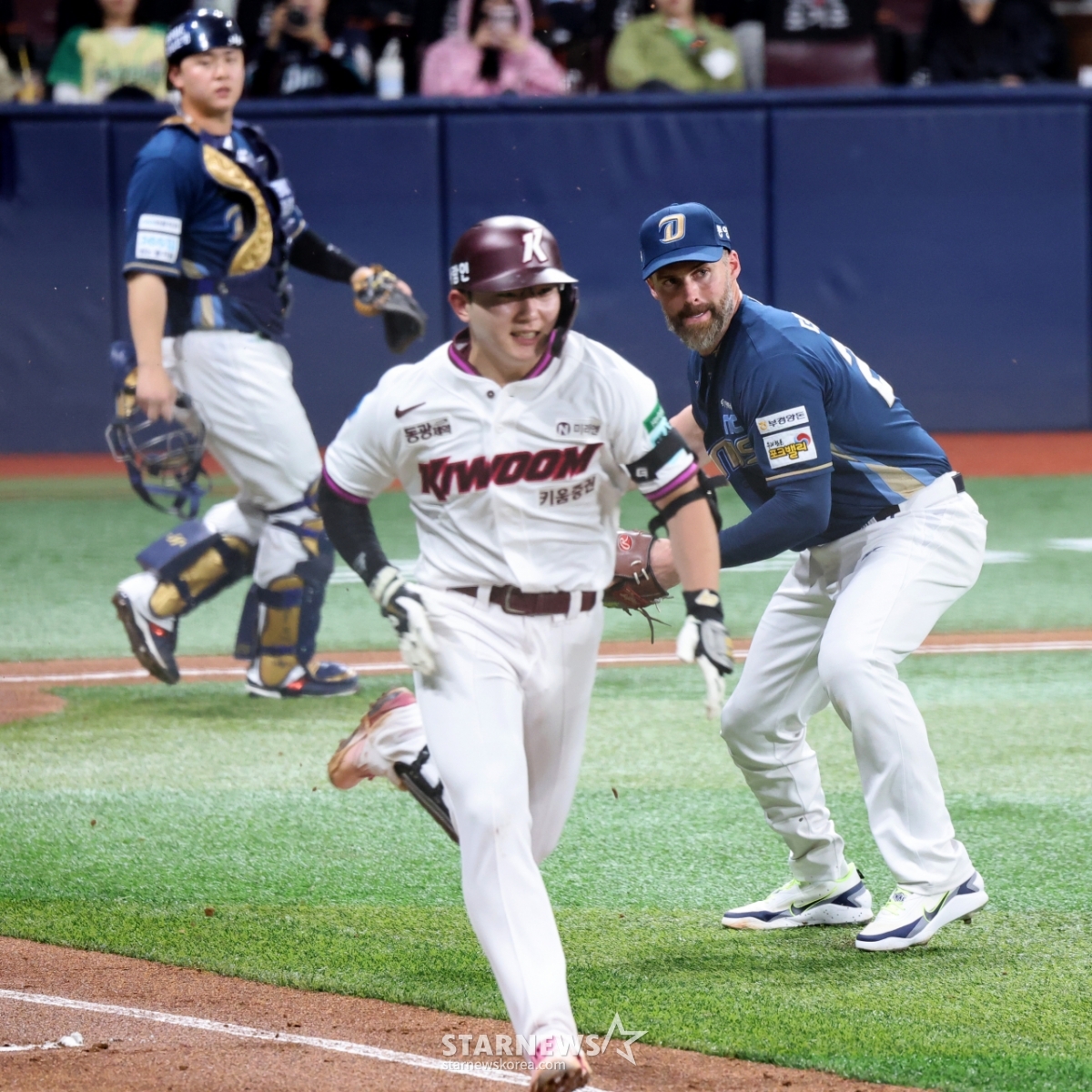 Первый бейсмен NC Дэвидсон жалуется на первую базу, чтобы поймать Сон Джи Ху, который сделал первый батт Мусы в конце четвертого раунда 2026 KBO лиги Kiwoom Heroes и NC Dinos в Gocheok Sky Dome 21-го числа. 2026.04.21.