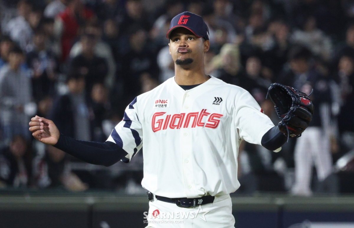 Стартер Лотте Родригес радуется после того, как в начале шестого иннинга он выбил Ян Сок Хвана из Дусана.