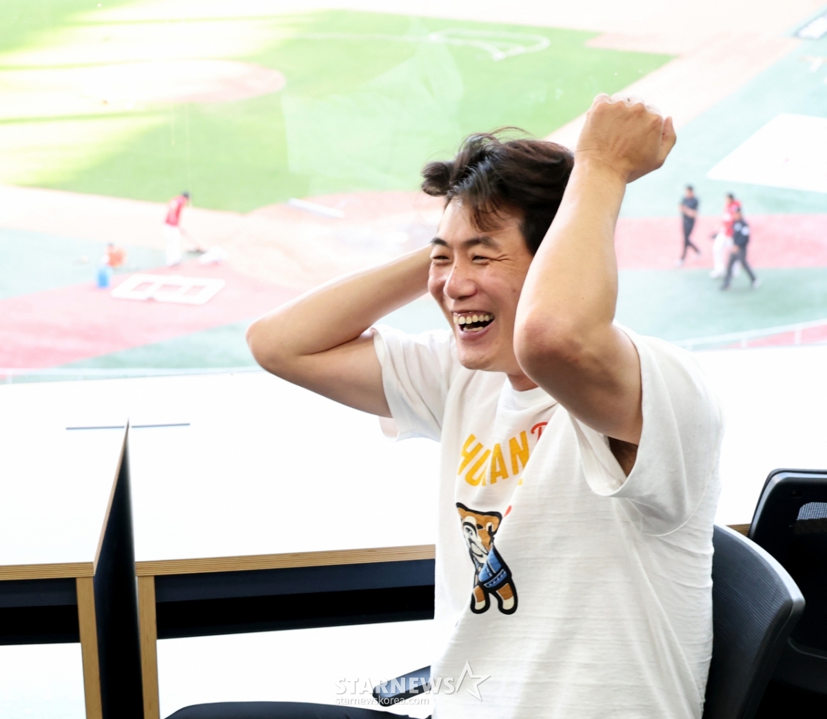 Ким Кван Хван, который отрезал смех на плече и находится в процессе реабилитации, посещает пресс-зал перед матчем Лиги 2026 между SSG Landers и KTWiz 24-го числа, чтобы поговорить с журналистами о ходе операции. 2026.04.24.