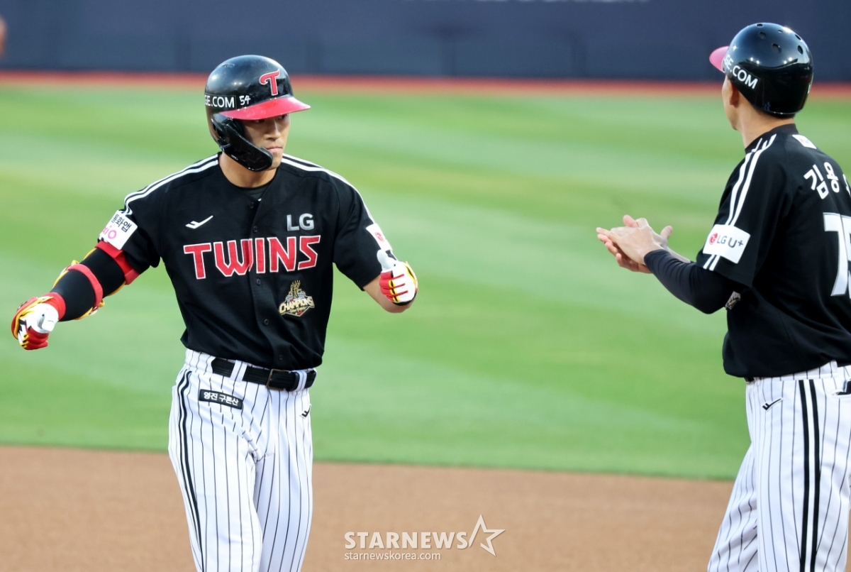 2-й нападающий LG Чон Сон Хо на базе с одним RBI попаданием с третьей базы 2026 KBO Лиги Twins и KTWiz в начале первого иннинга игры KTWiz в парке Сувон KTWiz 28-го числа. 2026.04.28.