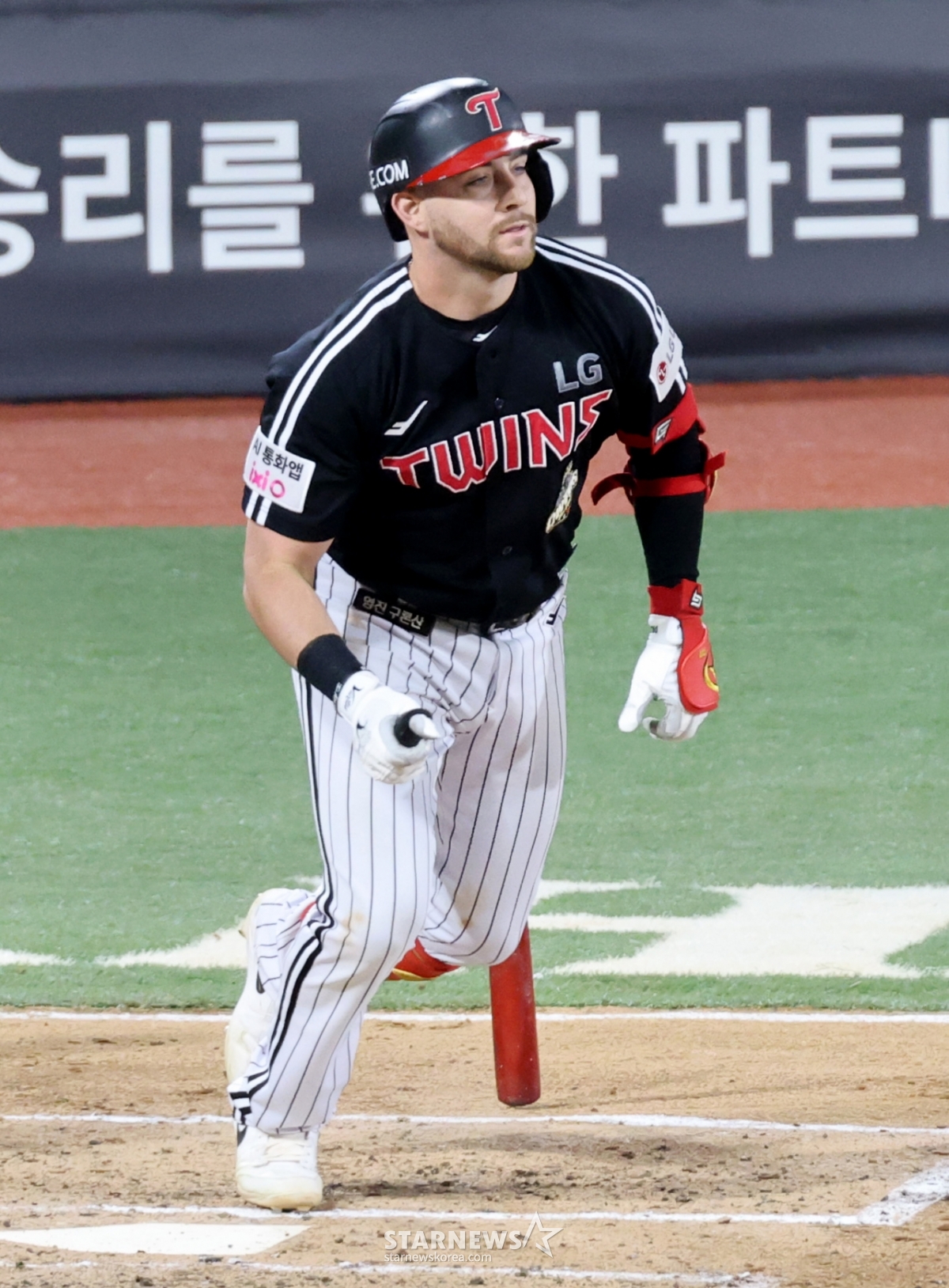 3-й нападающий LG Остин направляется на первую базу после того, как ударил по мячу так же жестко, как в начале 7-го иннинга между LG Twins и KTWiz Лиги 2026 KBO, который состоялся в парке KTWiz в Сувоне 29-го числа. 2026.04.29.