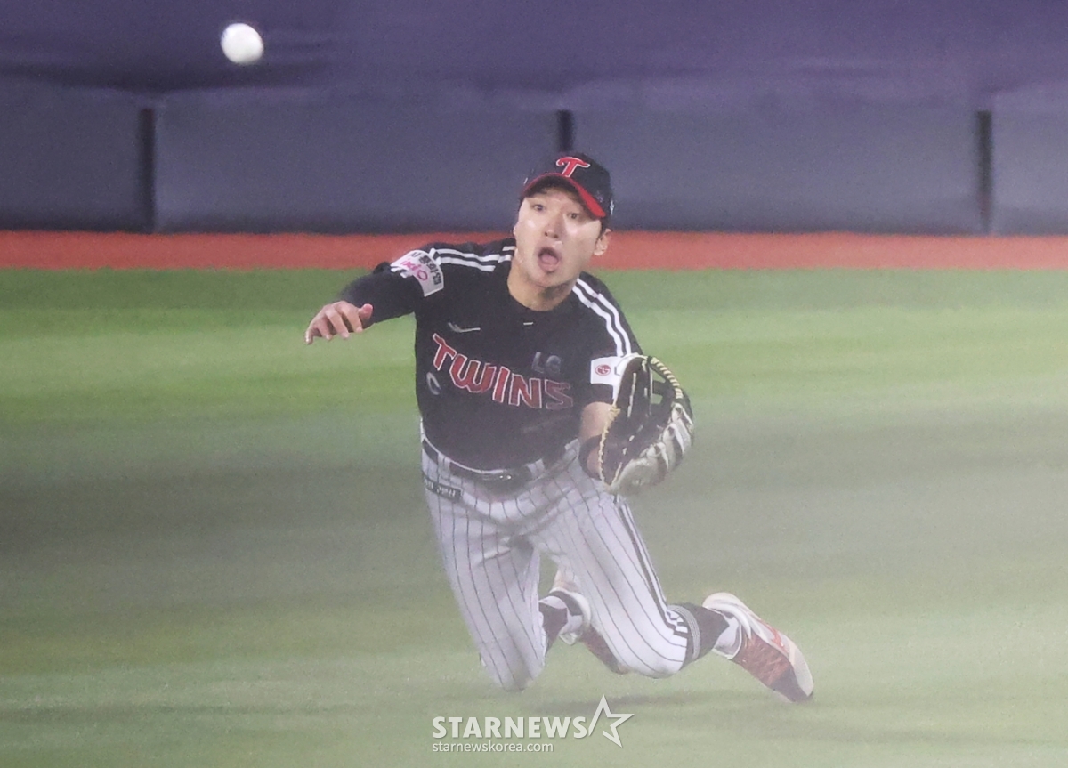 Полузащитник LG Пак Хэ Мин ныряет и ударяет ударом Ким Хён Су в конце шестого иннинга между LG Twins Лиги 2026 KBO и KTWiz, состоявшегося в парке KTWiz в Сувоне 30-го числа. 2026.04.30