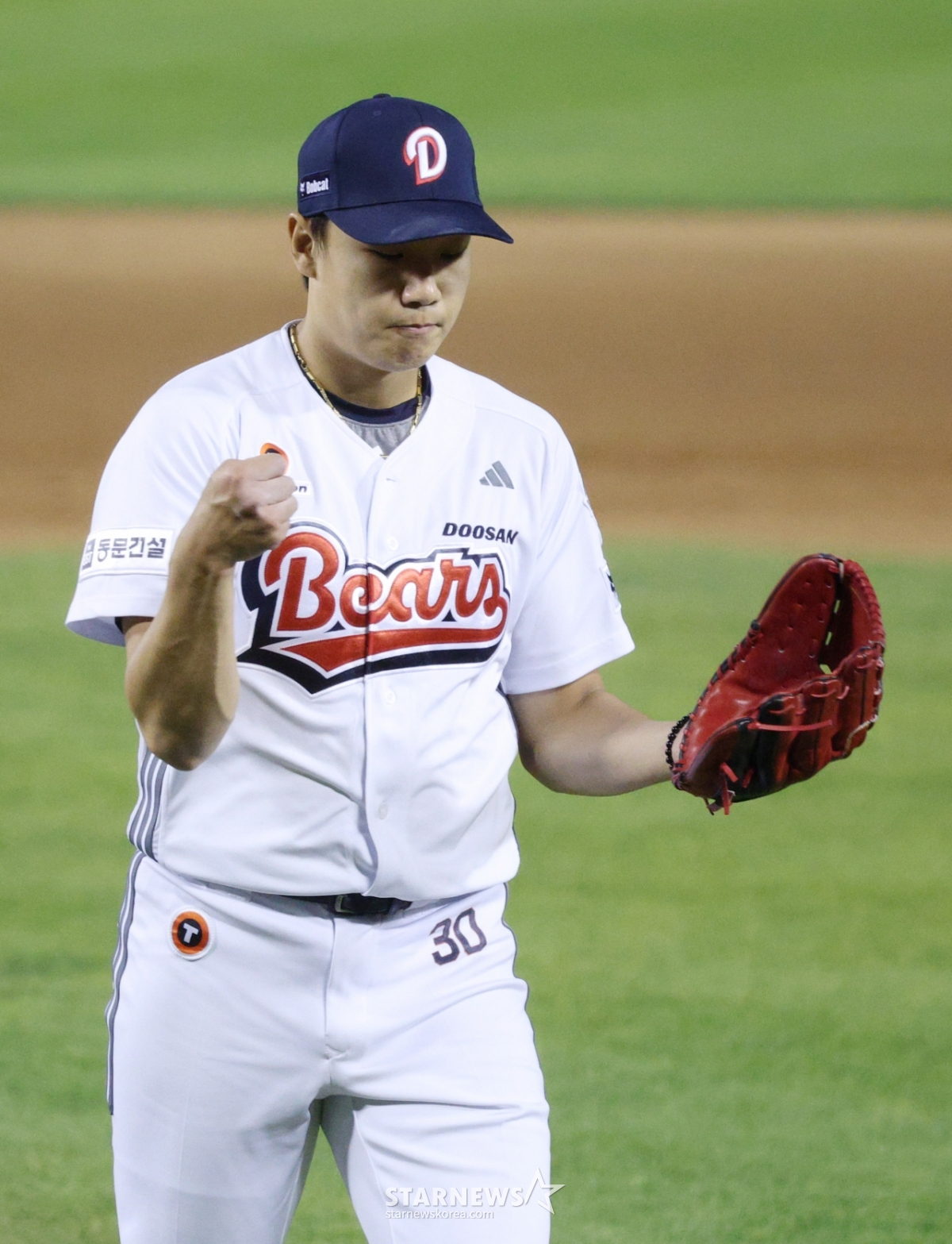 Дусан Янджехун счастлив после того, как в начале шестого иннинга обработал Чхве Хён У из Самсунга как воздушный шар на 2-й и 3-й базах.
