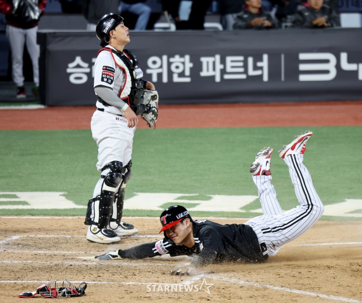 Когда LG Park Hae-min ударил с LG Twins и KTWiz лиги 2026 в начале восьмого иннинга в парке KTWiz в Сувоне 30-го, Мун Бо-кюн, второй базы, набирает очки. Слайд-стридинг... 2026.04.30