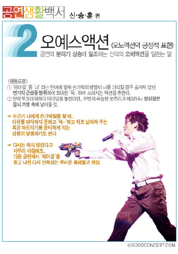 현재까지 공개된 '공연생활백서'는 모두 7가지로, 공연의 '물'관리를 위해 아껴뒀던 옷을 입고 오라는 의미의 '수질관리의 의무감', 공연의 흥을 돋우기 위해 오버액션을 서슴치 말라는 의미의 '오예스액션'(오노액션의 긍정적 표현) 등이다.