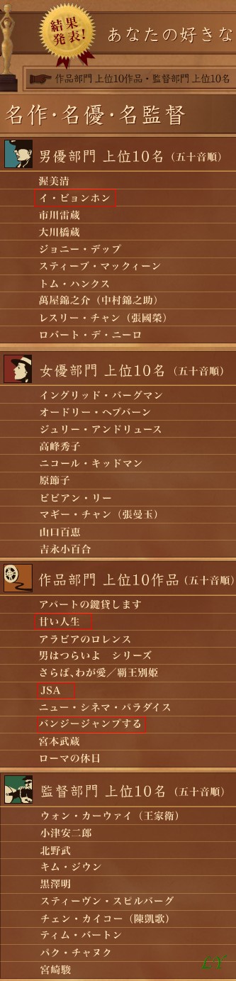 특히 이병헌은 일본인이 좋아하는 명작영화 10선 부문에 '달콤한 인생', '공동경비구역 JSA', '번지점프를 하다' 등 주연작 3편이 한꺼번에 올리는 기염을 토했다. 명작영화 10선에는 '아라비안 로맨스', 일본영화 '남자는 괴로워', '로마의 휴일', '시네마천국' 등도 포함됐다.