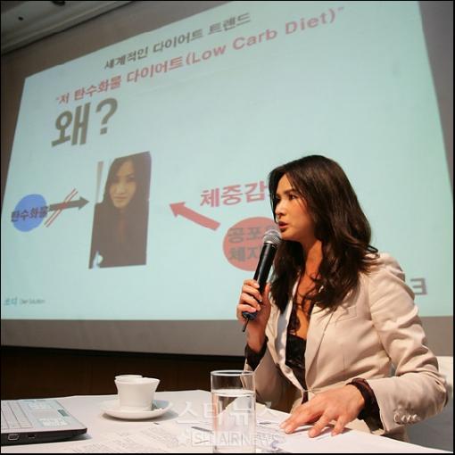 슈퍼모델 출신 이소라가 9일 오전11시 서울 신라호텔에서 가진 '쏘디 다이어트' 기자회견에서 직접 제품을 설명하고 있다.