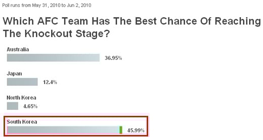 축구 전문 사이트 골닷컴이 2010 남아공 월드컵에 출전하는 아시아 4개국 중 한국의 조별리그 통과 가능성이 가장 높다고 평가했다.