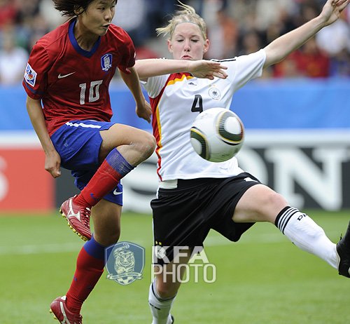 지소연이 독일 수비수를 앞에 두고 볼다툼을 벌이고 있다. 대한축구협회 제공