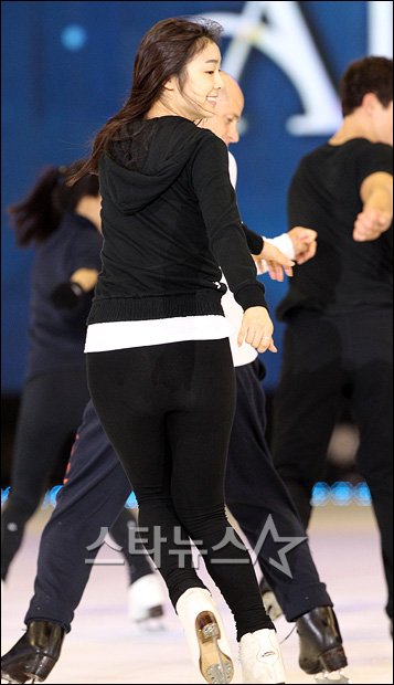 피겨여왕 김연아가 12일 오후 서울 송파 올림픽 체조경기장에서 '삼성갤럭시 하우젠 올댓스케이트 썸머 2011' 단체무대 연습을 하고 있다.