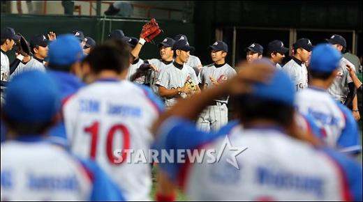 6일 오후 서울 목동야구장에서 열린 제25회 세계청소년야구선수권대회 결선리그 한국과 일본의 경기에서 일본이 4대2로 승리하고 기뻐하고 있다.