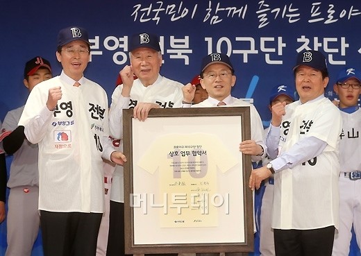 부영그룹과 전라북도-전주시, 군산시, 익산시, 완주군(이하 공동 연고지)은 13일 오전 롯데호텔 3층 사파이어볼룸에서 '전 국민이 함께 즐기는 프로야구, 부영-전북 10구단 창단 선포식' 및 협약식을 개최했다.