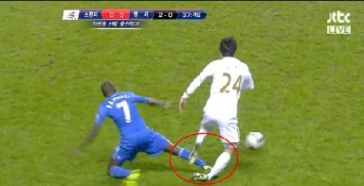 그러나 이날 경기 도중 한국 축구팬들의 가슴을 쓸어내린 아찔한 장면이 발생했다. 양 팀이 0-0으로 팽팽하던 전반 37분 기성용을 향해 하미레스가 살인적인 태클을 가한 것이다.