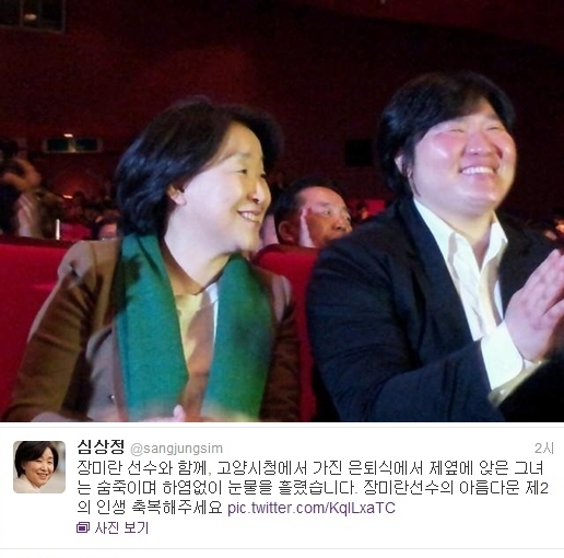 심상정 의원은 이날 자신의 트위터에 "장미란 선수와 함께 고양시청에서 가진 은퇴식에서 제 옆에 앉은 그녀는 숨죽이며 하염없이 눈물을 흘렸습니다. 장미란 선수의 아름다운 제2의 인생 축복해주세요"라는 글과 함께 사진을 올리며 그를 응원했다. 장미란은 은퇴 후 용인대학교 박사과정과 장미란 재단 활동에 전념할 예정이다.
