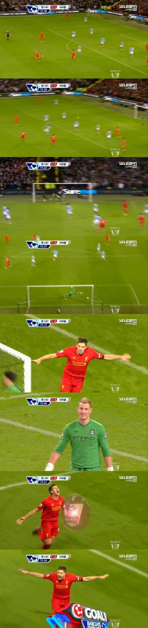 전반전은 1-1로 끝난 가운데, 팽팽하던 경기 균형은 후반 28분 깨졌다. 그 주인공은 리버풀의 캡틴 스티븐 제라드였다. 제라드는 경기장 중앙 지역에서 가슴 트래핑으로 공을 떨군 후 한 번 바운드된 공을 지체 없이 오른발 슈팅으로 연결했다. 이 공은 제라드의 발등에 그대로 얹혔고, 빠른 속도로 조 하트의 손을 지나 맨시티 골망 좌측 하단에 원바운드로 꽂혔다.