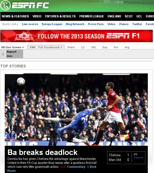 첼시는 1일(이하 한국시간) 영국 런던 스탬포드 브릿지에서 열린 '2012~13 시즌 잉글랜드 FA컵' 8강 재경기에서 맨유를 홈으로 불러들여 1-0으로 승리했다.