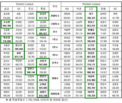 한국야구위원회(KBO)는 1일 오전 '2013 한국야쿠르트 세븐 프로야구 올스타전' 팬 인기투표 3차 중간집계(유효투표수 1,792,166표·6월 30일 18시 기준) 결과를 발표했다.