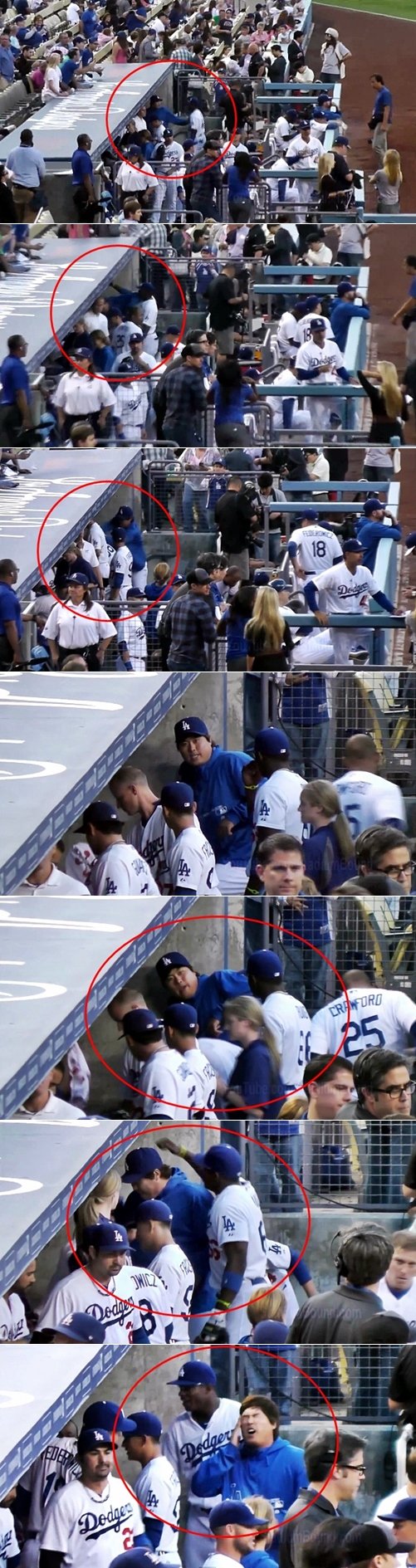 '사건'이 벌어진 장소는 다저스타디움의 3루쪽 더그아웃. 갑자기 푸이그의 장난기가 발동한 것일까. 더그아웃 안쪽에 얌전히 있던 류현진을 향해 푸이그가 통통 뛰며 돌진하기 시작했다.