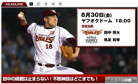 양대 리그에서 다승-평균자책점-승률 모두 1위를 달리고 있는 다나카는 앞으로 대여섯 번 정도 더 마운드에 오를 예정이다. 다음 시즌 메이저리그 진출이 유력한 다나카가 과연 언제까지 무패 행진을 질주할 지 관심이 집중된다.