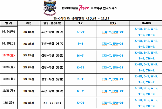KBO는 오는 24일 대구구장에서 시작되는 '2013 한국야쿠르트 세븐 프로야구' 한국시리즈의 중계일정을 확정, 발표했다.