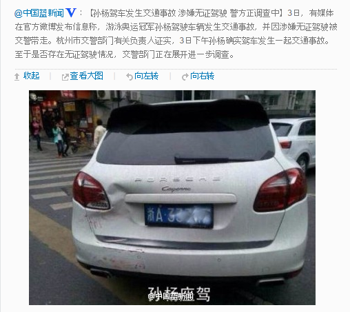 쑨양은 3일 오후 2시30분(현지시간) 저장성 항저우에서 친척 소유의 포르쉐 카이옌을 운전하다가 버스와 추돌했다. 쑨양은 당시 사고를 당한 것이었지만 면허증이 없이 차를 운전한 것으로 드러나 비난을 받았다.