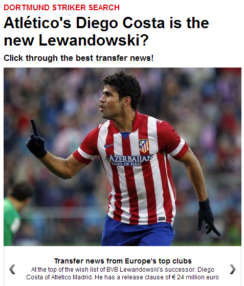 이에 도르트문트는 다음시즌 레반도프스키의 공백을 메워줄 유력한 영입후보로 코스타를 올려놨다. 코스타 역시 도르트문트 이적에 긍정적인 반응을 보인 것으로 전해졌다.
