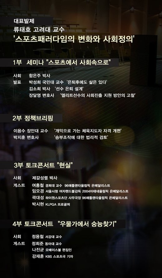 이어 토크 콘서트로 진행될 3부와 4부는 각각 '한국 스포츠의 현실' 및 '스포츠 개혁을 위한 노력과 과제'를 주제로 제갈성렬 박사(스피드 스케이팅), 여홍철 경희대 교수(체조), 정희준 동아대 교수, 나진균 전 프로야구선수협회 사무총장 등이 그동안 겪은 체육계 내부의 현실을 드러내며 한국 스포츠의 발전 방향을 제시할 예정이다.