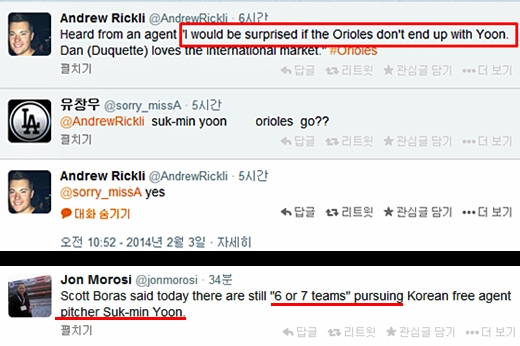 미국 스포츠릴 보스턴의 앤드류 리클리 기자는 4일(한국시간) 자신의 트위터에 한 에이전트의 말을 인용하며 "만약 윤석민이 볼티모어와 계약을 하지 않는다면 (이는) 매우 놀라운 일이다"고 적었다.